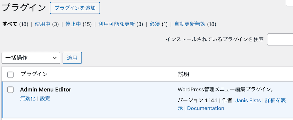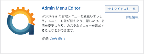 プラグイン追加画面にて「Admin Menu Editor」と検索し、インストールします。