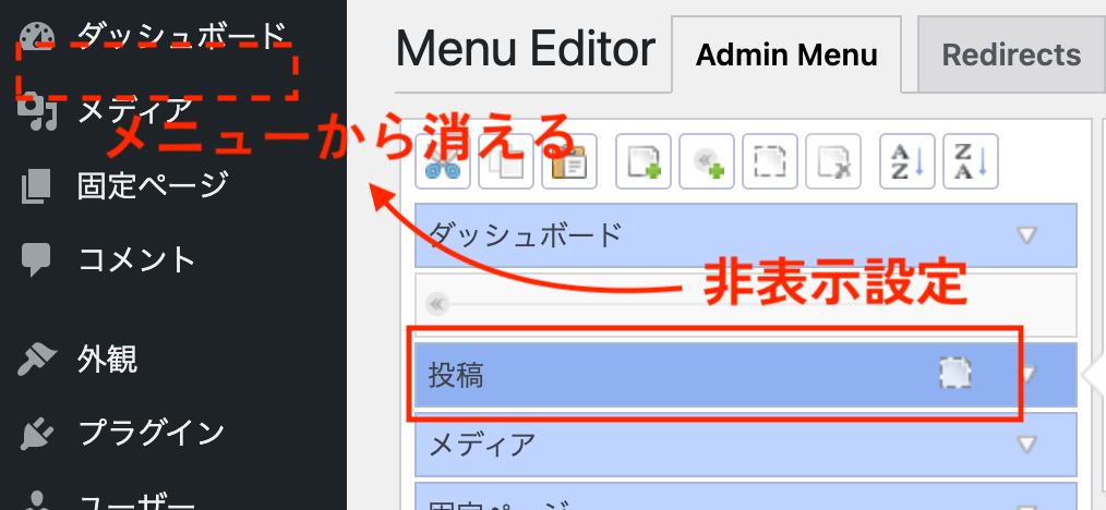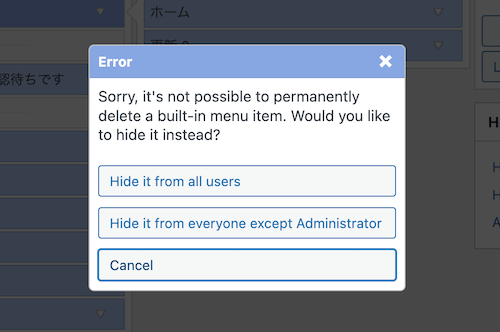ダッシュボードや投稿、外観や設定といったWordPressデフォルトのメニューは削除できません。これらを見せたくない場合は「非表示」を使用します。