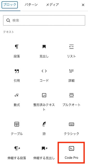 有効化すると投稿ブロックに「Code Pro」が追加されます。