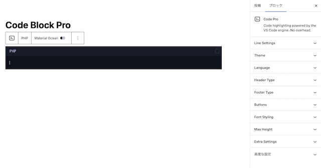 ブロックを選択すると、コードエディターが表示されます。各追加設定は右側にあるブロック設定から行います。