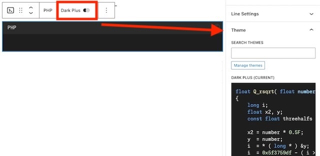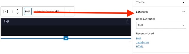 必ず必要な言語とテーマは、ブロックのツールバーでクリックすると、設定項目が開きます。