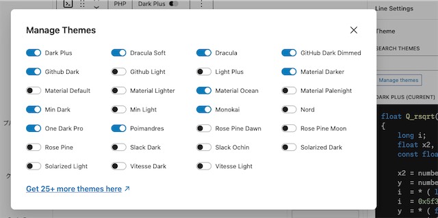 テーマは20種類以上から選択できます。全て表示させておくといちいち選ぶのも大変です。「Manage Themes」から、自分の好きなテーマ、使用するテーマだけを表示させておくようにできます。