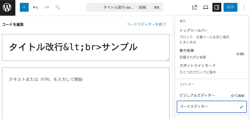 「コードエディター」に変更してからHTMLタグを入力することがポイントです。