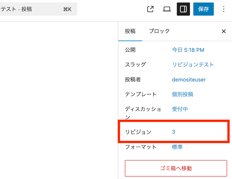 その投稿にリビジョンがあれば、エディターの右側の投稿パネルに表示されます。
